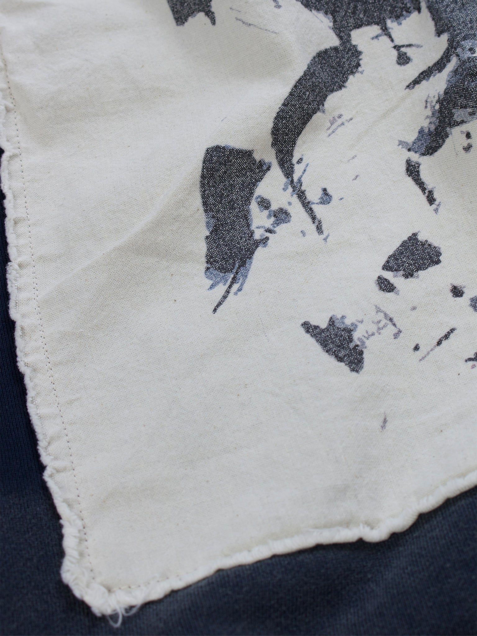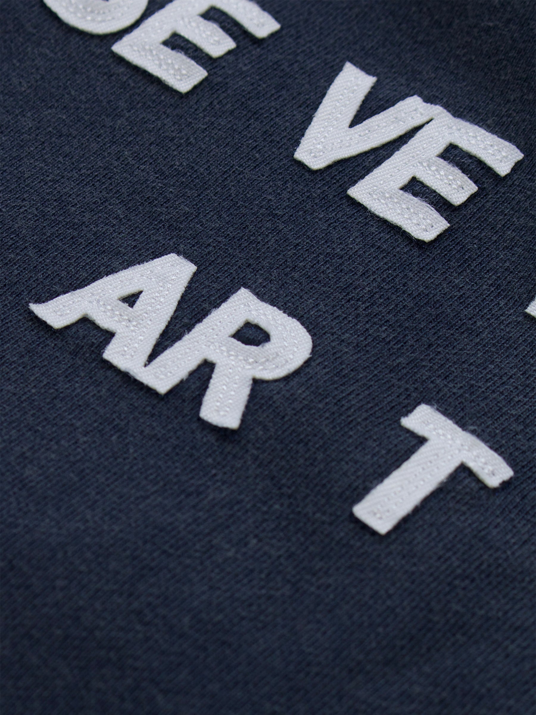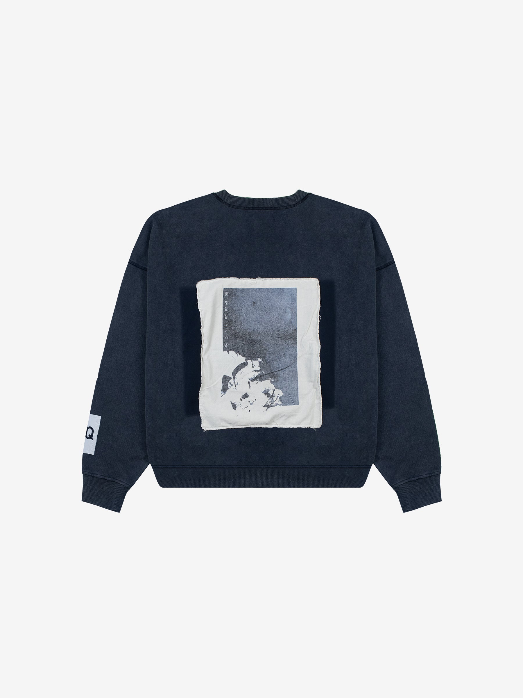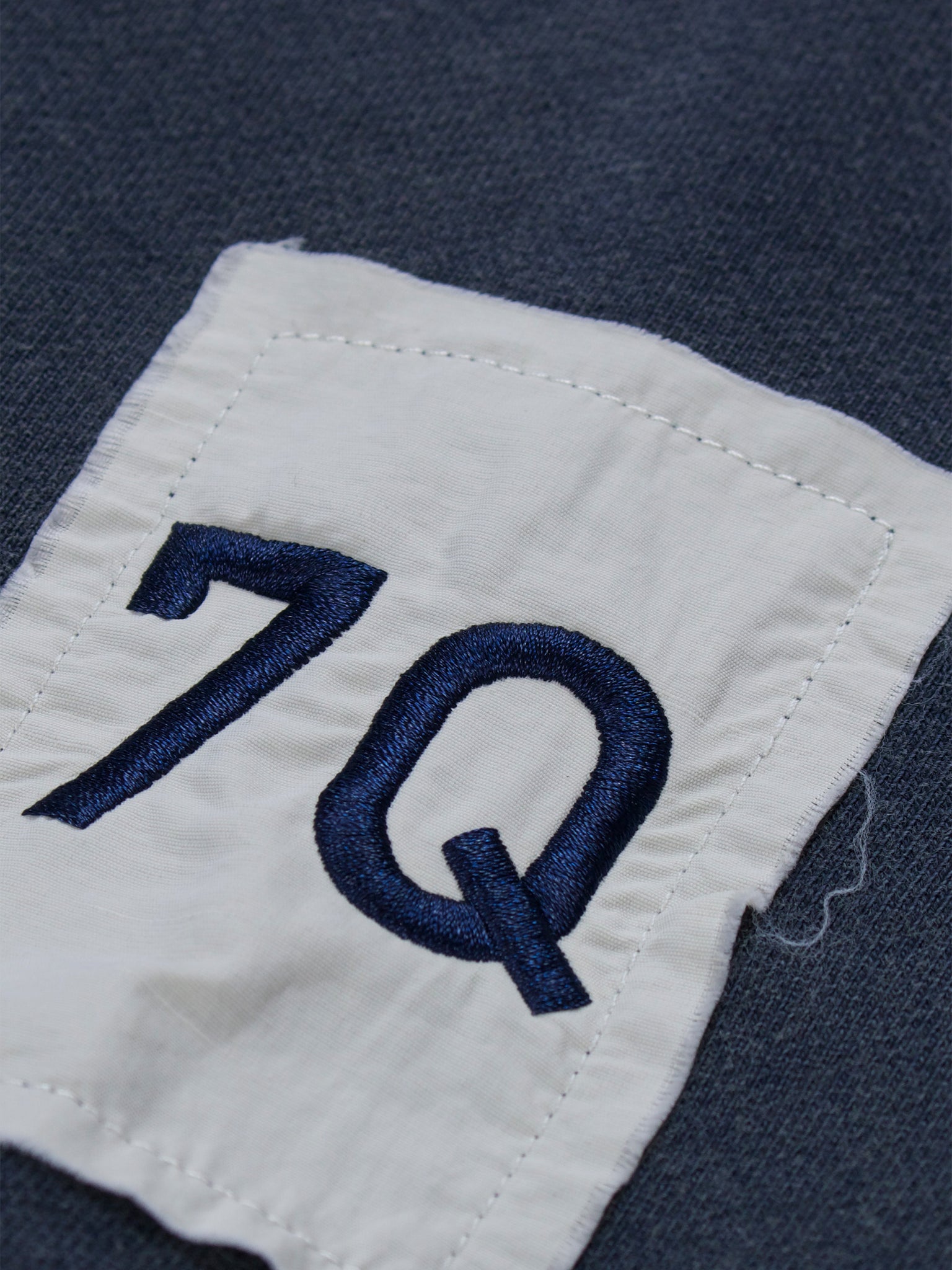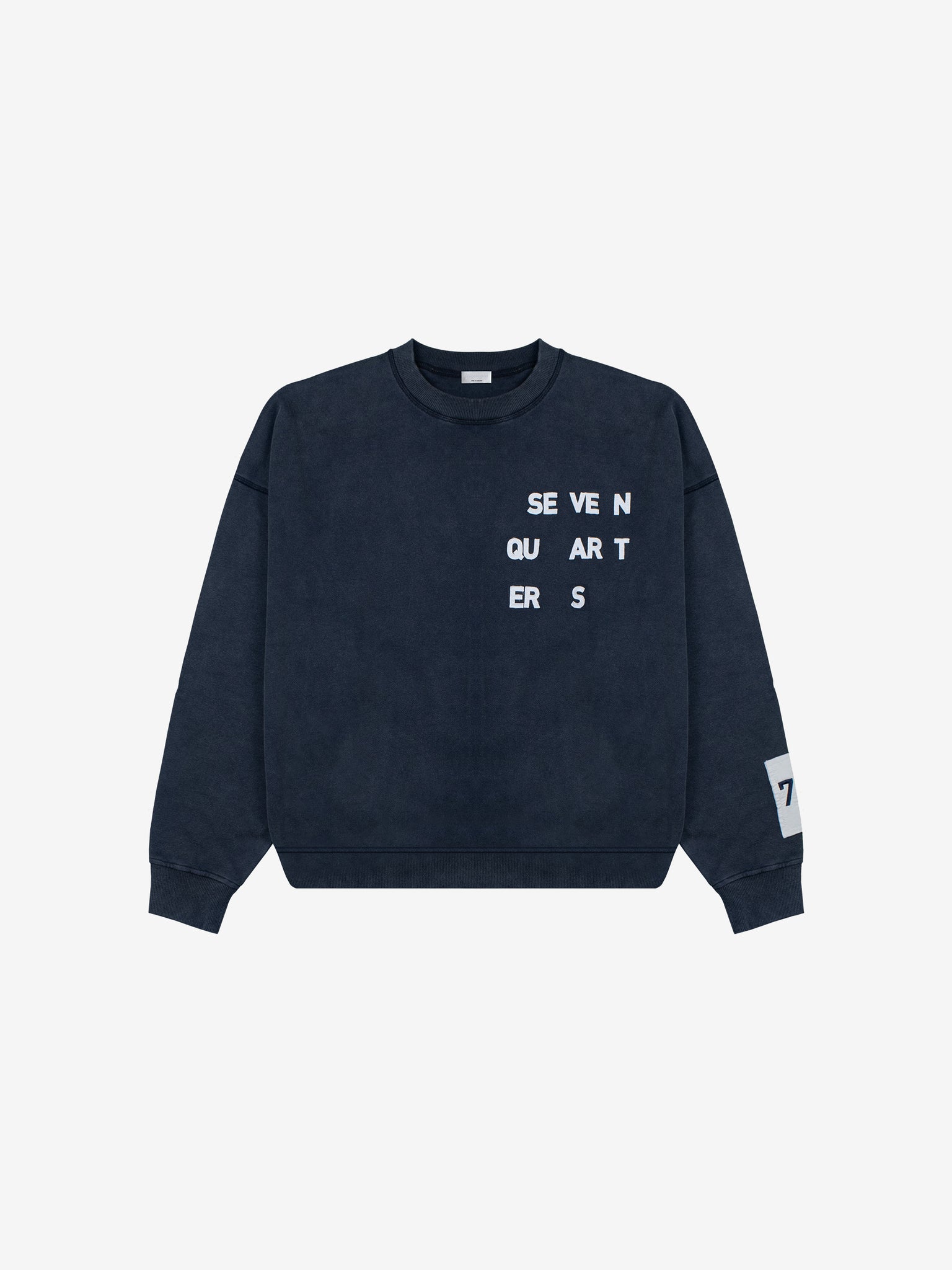 An acid-washed navy sweat developed as part of an early design phase, defined by its large appliqué Seven Quarters logo across the chest. Each letter is individually cut from separate fabric and stitched into place, creating depth and a tactile, constructed finish. A sleeve patch featuring embroidered 7Q branding completes the piece - a study in texture, layering, and considered detail.